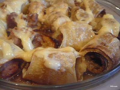 каждый положить немного начинки и свернуть рулетиком. Выложить в посуду