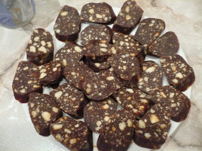 Печенье октябрьское – 400г Сахар – 1 стакан Масло слив. – 200г Яйцо – 1 шт Какао – 2 ст.л. Молоко – 3 ст.л. Мелко поломать печенье. В другой посуде растереть яйца с сахаром, затем добавить масло, какао, молоко. Довести до кипения и чуть поварить. Смешать массу с печеньем, завернуть в пергаментную бумагу или фольгу в форме колбаски. Положить в морозилку на пару часов.